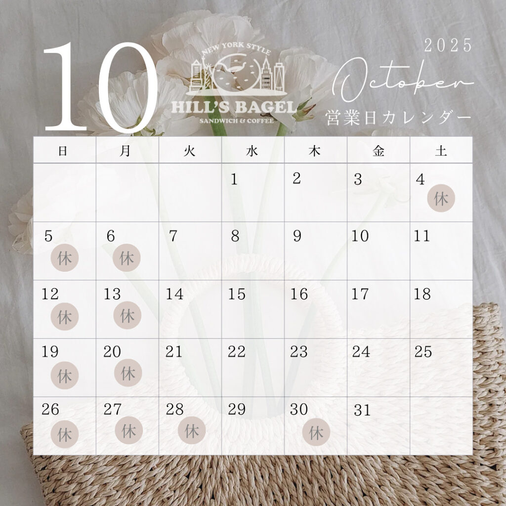 2025/10/01 🍂【10月の営業日カレンダー】🍂 いつも HILL’S BAGEL をご利用いただきありがとうございます🥯☕ 10月の定休日と臨時休業のお知らせです。 🔹定休日:日曜・祝日、月曜日 以下の日は都合によりお休みさせていただきます。 ご不便をおかけしますが、よろしくお願い致します 🔹臨時休業:10/4(土)、10/28(火・群馬県民の日)、10/30(木) ご来店の際は営業日をご確認のうえお越しください🌿 みなさまのご来店を心よりお待ちしております😊💛