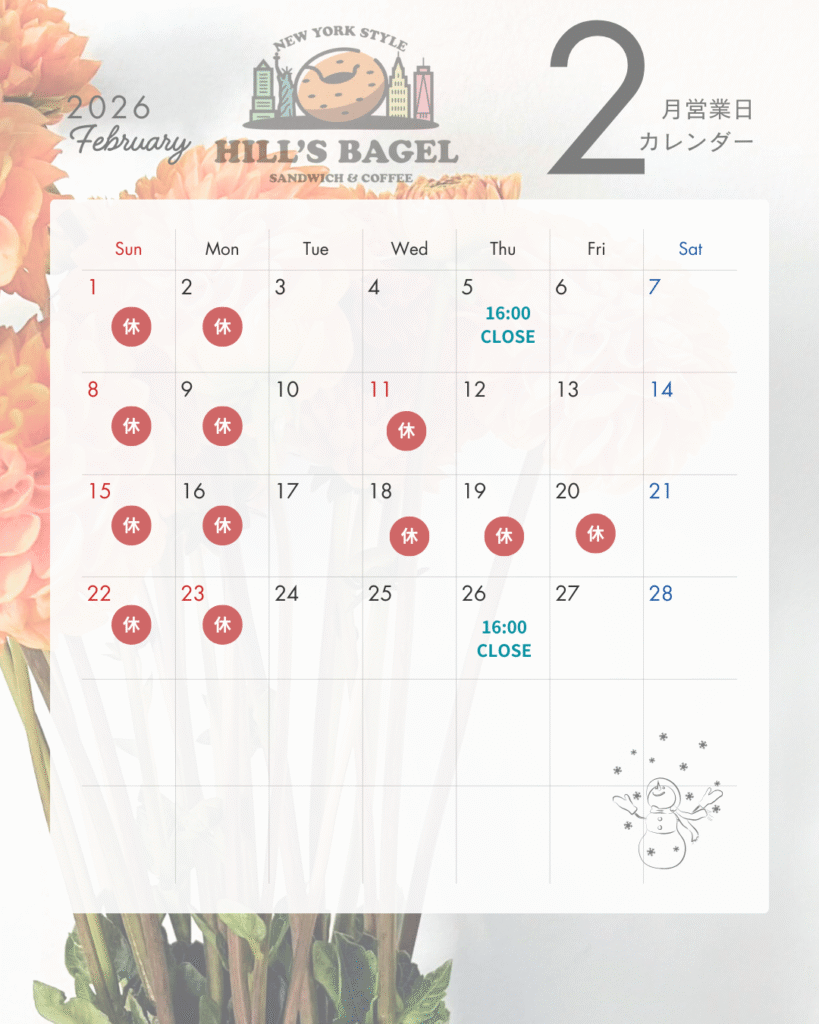 🥯 HILL’S BAGEL|2月の営業日のお知らせ ☕️ いつもヒルズベーグルをご利用いただきありがとうございます。 2026年2月の営業日カレンダーです。 📅 定休日 (日祝、月曜日) 臨時休業日 ・2/11(水・祝) ・2/18(水)、2/19(木)、2/20(金) ⏰ 営業時間変更日 ・2/5(木) 11:00〜16:00 ・2/26(木) 11:00〜16:00 そのほかの日は通常営業予定です。 ご来店の際は、ぜひカレンダーをご確認ください✨ 2月も、焼きたてベーグルとコーヒーをご用意してお待ちしています☺️